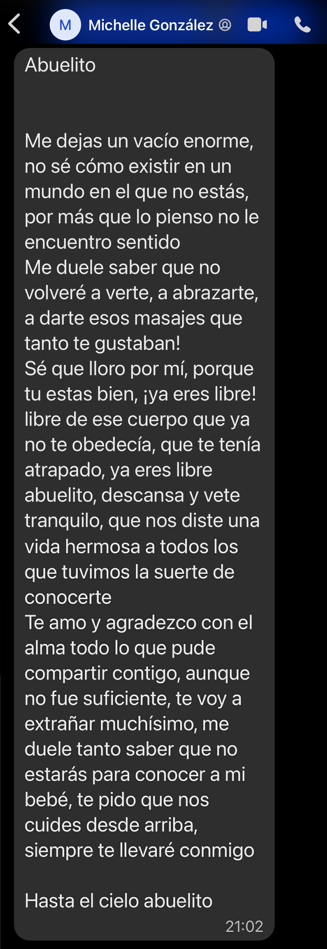 Ambos dejan en sus familias un legado invaluable de remembranzas y enseñanza de valores humanos sinigual. Su aportación en claros ejemplos de amor para con los suyos, tenacidad e indiscutible responsabilidad en el trabajo, impavidez e inteligencia ante vicisitudes durante su vida además del respeto y empatía en su entorno, nos indican su convicción a los más sublimes sentimientos de bondad, rectitud y humanidad.
